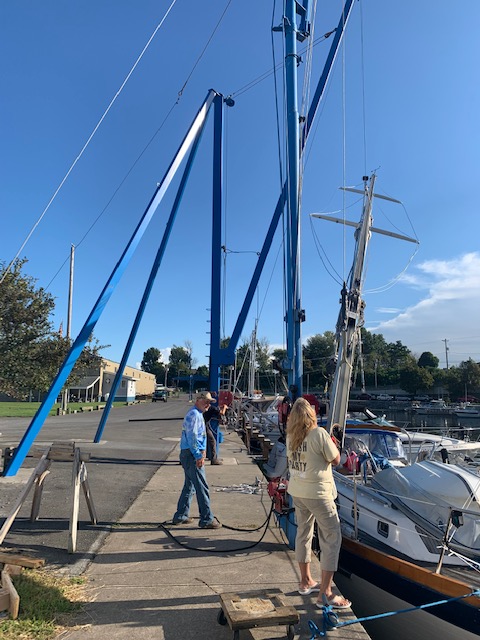 We thought our turn for servicing the mast would be Tuesday, but the marina had 2 sailboats in front of us with masts to be stepped (put UP). They told us if we could get everything ready before 2 pm, we could still get ours down. The challenge was on! We scoured the “bone pile” of discarded mast supports from other boats; measured stern, bow and mid-boat heights numerous times; and finally chose some supports that looked like they would work. By the time we got that completed, along with loosening the mast stays and clearing the decks, it was 2:30 pm. Too late for Tuesday, but we were promised that we could be second the next day. Wednesday brought very dark skies and the rain began as the catamaran in front of us was getting his mast up. Wanting to get ours done, but not really wanting to do it in a driving rain, we were quite relieved when the marina crew said “no way”! Another day of waiting – what’s new? We are resigned to learning to be more patient, since so many things are out of our control – the weather and marina schedules being two of those.