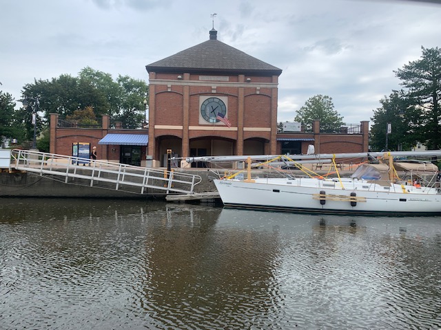 We arrived at Oswego, NY a few days early so that we could sit out the forecasted thunderstorms. Our first destination was the Oswego Yacht Club, which had welcomed fellow sailors from GTYC (Annie and Dietrich on Calliope) a few years ago. Unable to get any response on the phone, Lisa emailed the commodore, and we received a sad note back that the yacht club had been “removed” by the city through eminent domain! The harbor was under complete reconstruction, and eventually will be home to the City’s port – Oswego Marina. The current Oswego Marina is across the river- it is small and old, and home to the sport fishing fleet. They did not have room for us until “mast down” day, and the alternative harbor was reported to be very shallow and very weedy, so we tied to the guest wall in the river, in front of the hotel. The good news was that our new refrigerator compressor and evaporator had arrived. Monday’s priority was getting that puppy installed, which went quite smoothly. How exciting to actually make ice instead of procuring and hauling it. Big smiles!