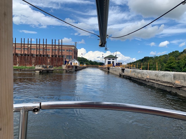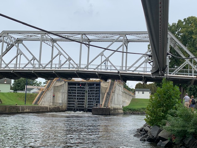 Thursday morning we pulled to the dock under the gin pole and within 2 hours the mast was down and securely fastened to the supports. We got a pump out, topped off fuel, and entered our first Oswego Canal lock! The first few locks were as expected, but we were soon motoring along the Oswego River. Most of us, when we hear the term canal, think of a concrete waterway, but those old waterways were mostly abandoned, and now the trip is mainly in riverways, with locks interspersed to deal with the elevation changes. It really felt more like “The African Queen” than expected. Some parts of the river were wild and remote with thick overgrowth, while others had many cottages/homes, docks and boats. We completed the 7 Oswego locks and 22 miles by 5 pm, and tied to the wall in Phoenix, a little town near the junction of the Oswego and Erie Canals. In the summer there is a crew of kids here that will run errands for boaters, but now that school had begun, all was quiet, and though there were several boats tied up here, most were locals.