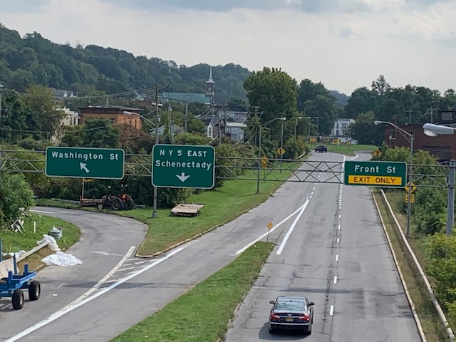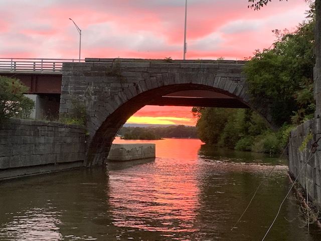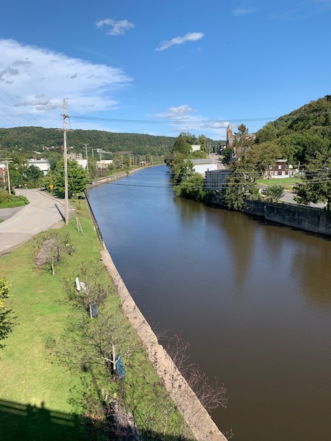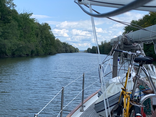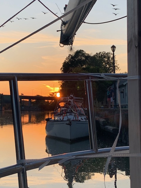 As we continued east on the canal, the rest of the locks all dropped in elevation, and became more frequent. Most days we motored 25 to 30 miles and transited 2 to 4 locks, also passing under numerous bridges. The mast was down due to the average bridge height of 23 feet. Along the way many towns had either a small marina or a wall to tie to. This part of the canal is actually the Mohawk River, and the shores were busy with trains and highways, so evening stops were pretty noisy, especially the train whistles! However, the Mohawk valley was gorgeous, with vistas of high rolling hills and steep rock. Near Schenectady, we finally got away from I-90 and the trains, and had a quiet stay at the Yacht Club on the river. The last part of the river had large conservation areas, and the herons, egrets, and other birds were numerous. The last 5 locks were set up as a “flight”, one into the next, with it’s terminus at Waterford, NY. As we exited the last lock, we snapped up one of the few remaining spaces on the long town dock to rest and celebrate completing the canal. It was September 17, about 4 weeks later than we had originally planned, but we were glad for the delays – we got to enjoy Canada and the Thousand Island area, and missed all the heavy rains from Hurricanes Henri and Ida, which had inundated New York City and Albany, causing the canal shutdowns. On we go!