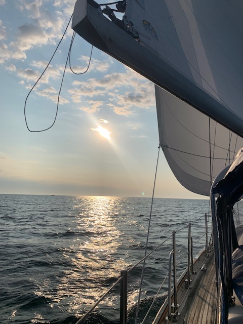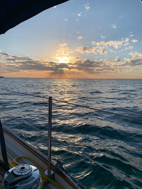 Harrisville is the only place along this coast where we had stopped 5 years ago when we bought Ritual in St. Clair Shores and sailed to Blind River, Ontario. The marina is very nice, with new docks since we were here last. There was live music in the park overlooking the harbor, and the musician, Josh Rose, is a teacher at Lowell HS. Yes, he knew our friend’s grandsons, and we had a nice chat. He is a good lyricist and we really enjoyed his songs. Aside from that and a walk to the ice cream shoppe, there is not much here in the way of services and therefore, no need to hang around. And our next 2 legs would be long ones at about 60 miles each. Count ’em – we average 6 knots/hour…