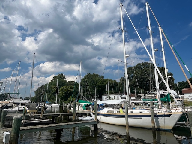 With the onset of hurricane season, we wanted you to know that we made our way back to Chesapeake Bay and are safely ensconced at Oak Harbor Marina on Rock Creek in Pasadena, MD.